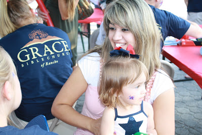 Kennedy turned four months on the Forth of July. She is getting so big, I can't believe how fast time is going by. For the fourth this year I started the day by running a 5k. After that I came home got me and the kids ready and we had our own little BBQ. Later in the evening we met up with Julie and Craig and went to the firework show at the quakes stadium. They had free face painting so I took advantage of it and got Brooklyn's face painted. Brooklyn was terrified of the fireworks she did not enjoy them at all she kept her face covered the whole time. On the other hand Kennedy really enjoyed looking up at them. Here are just a few pictures of the day.